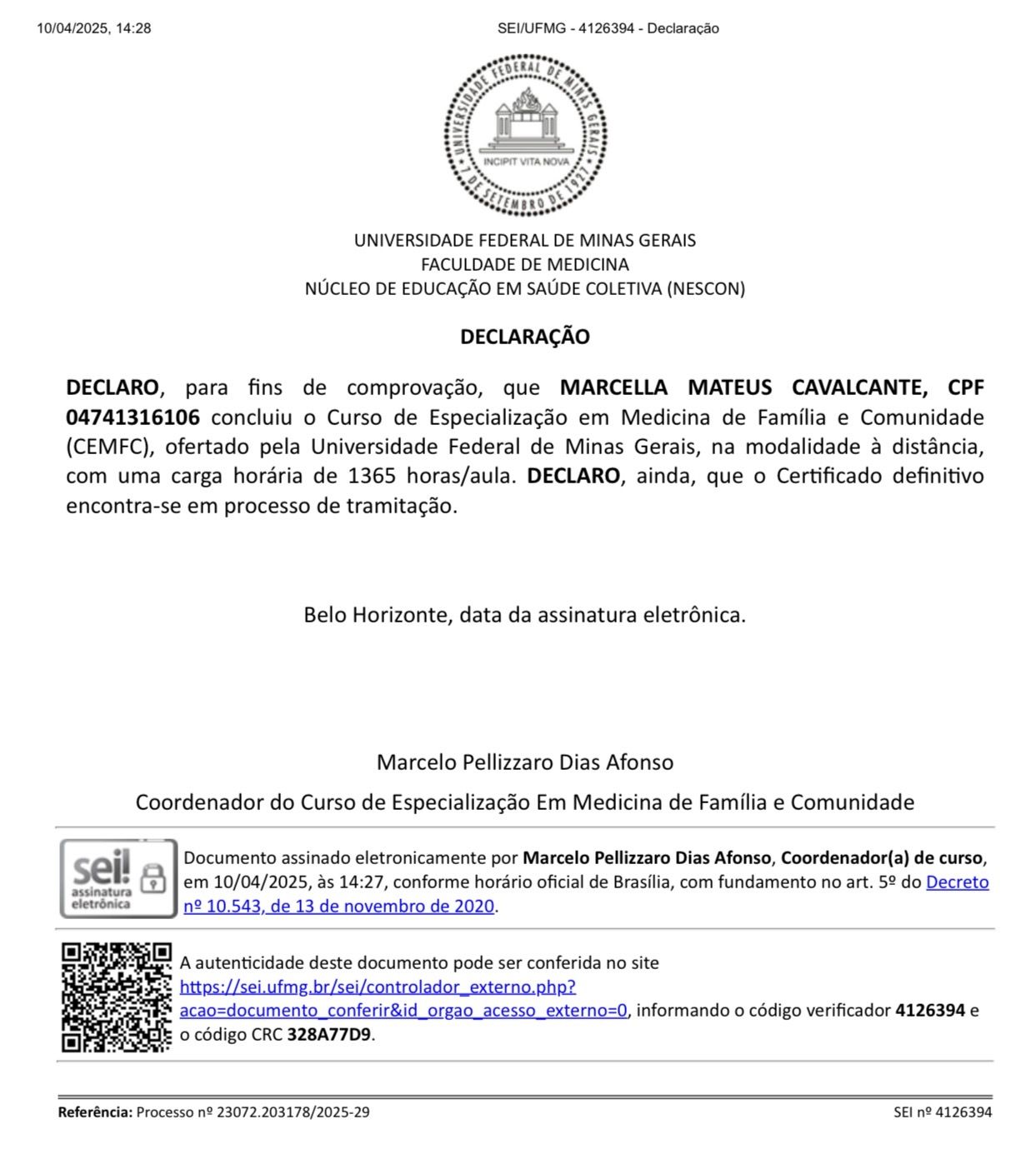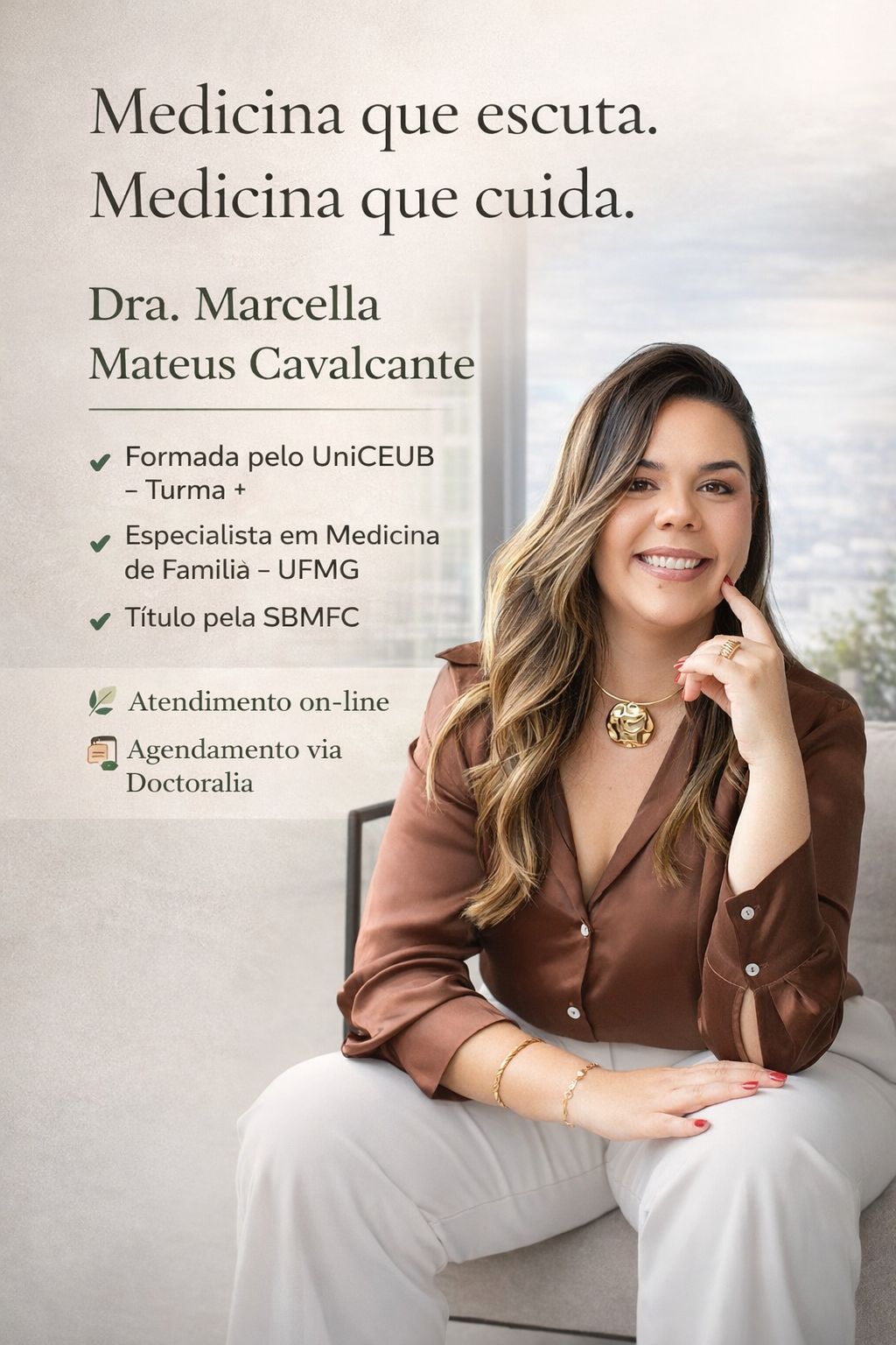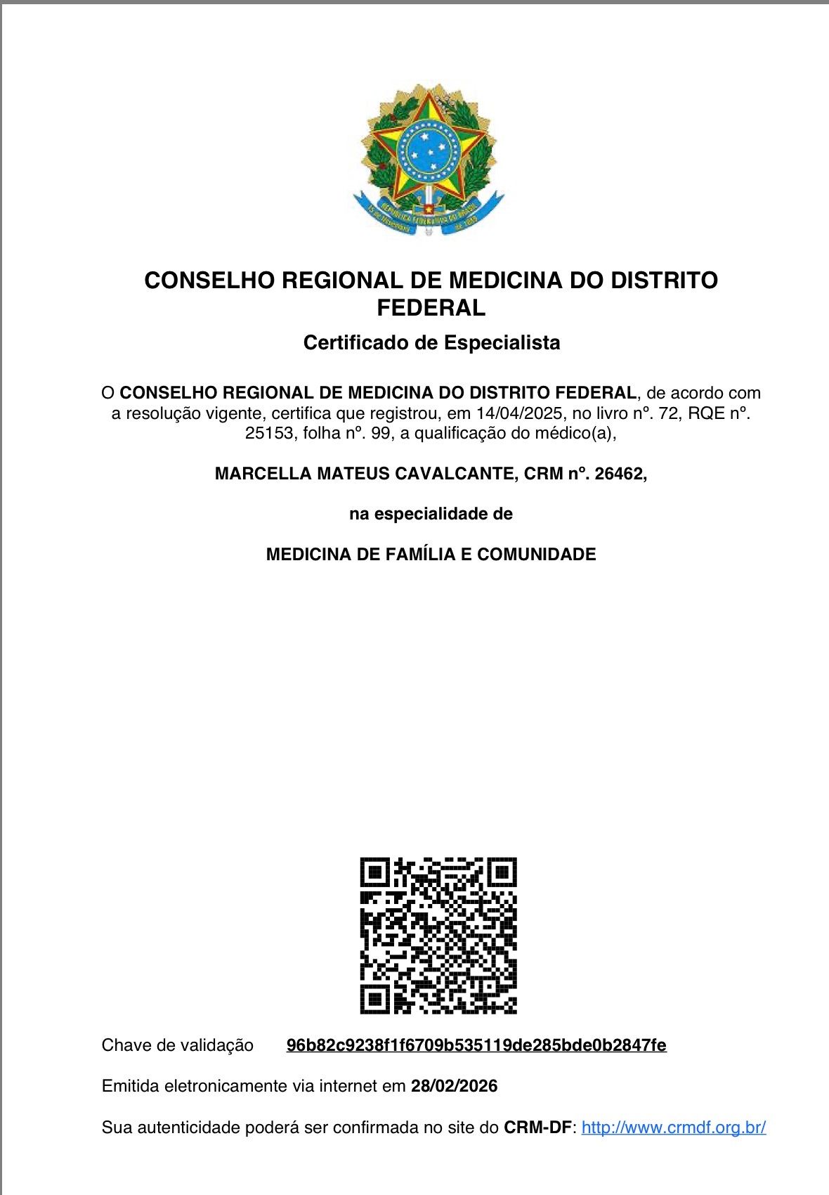 Sou médica especialista em Medicina de Família e Comunidade, com título pela Sociedade Brasileira de Medicina de Família e Comunidade (SBMFC) e especialização pela Universidade Federal de Minas Gerais (UFMG).